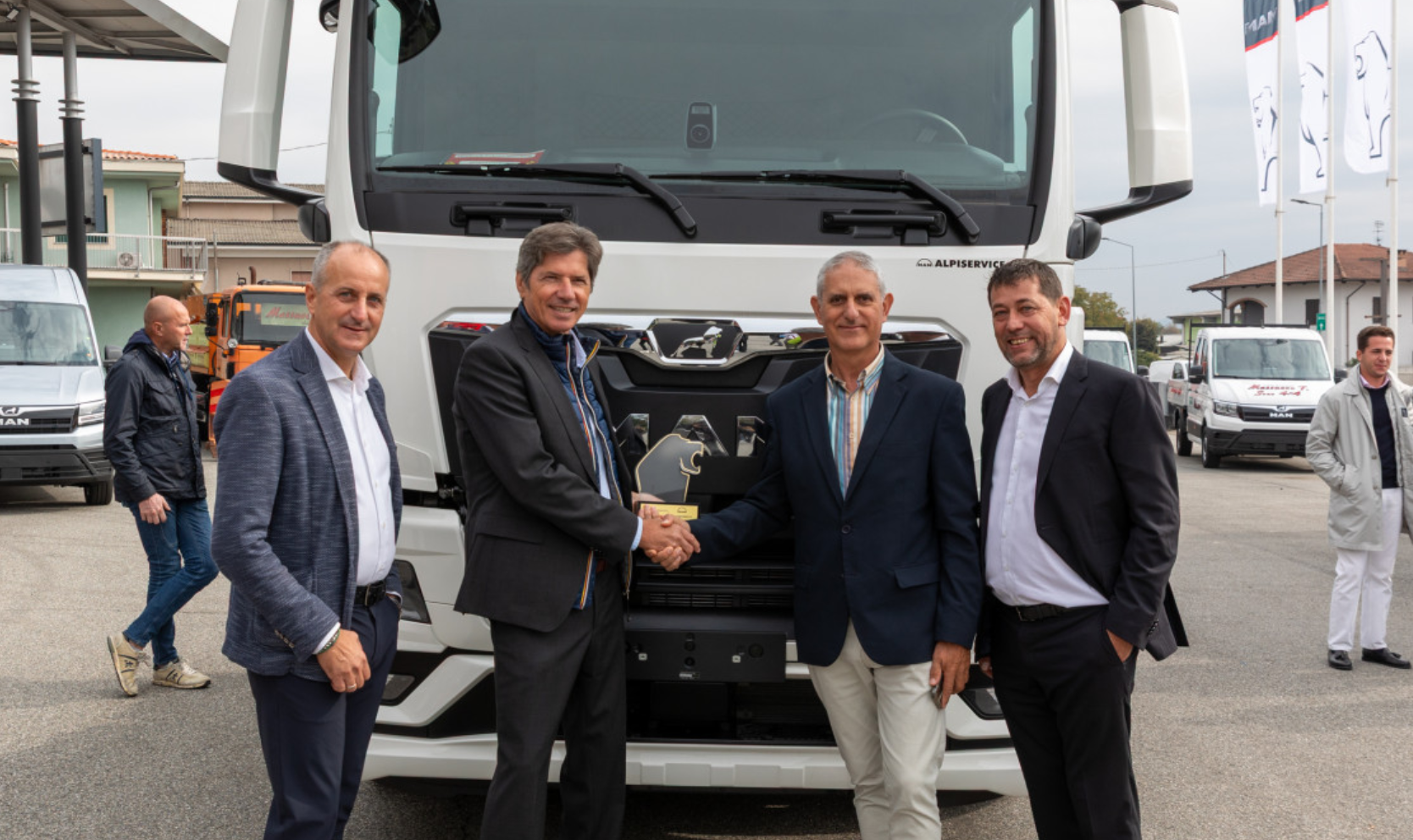In foto, da sinistra a destra: Lorenzo Boghich, Direttore Vendite e Prodotto Truck di MAN Truck & Bus Italia; Marc Martinez, Managing Director di MAN Truck & Bus Italia; Ingegnere Giorgio Crosetto di Sedamyl; Francesco Meineri di Alpiservice. Sullo sfondo: il MAN eTGS 100% elettrico.