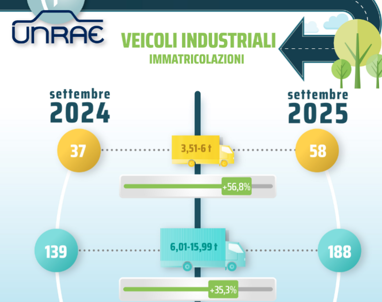 A settembre il mercato dei veicoli industriali ha registrato un incremento del 23,6% rispetto al 2024. Le nuove immatricolazioni raggiungono le 2.092 unità, in crescita rispetto alle 1.692 registrate l'anno precedente. In particolare, i veicoli leggeri da 3,51 a 6 t segnano un forte incremento, passando da 37 a 58 unità (+56,8%).