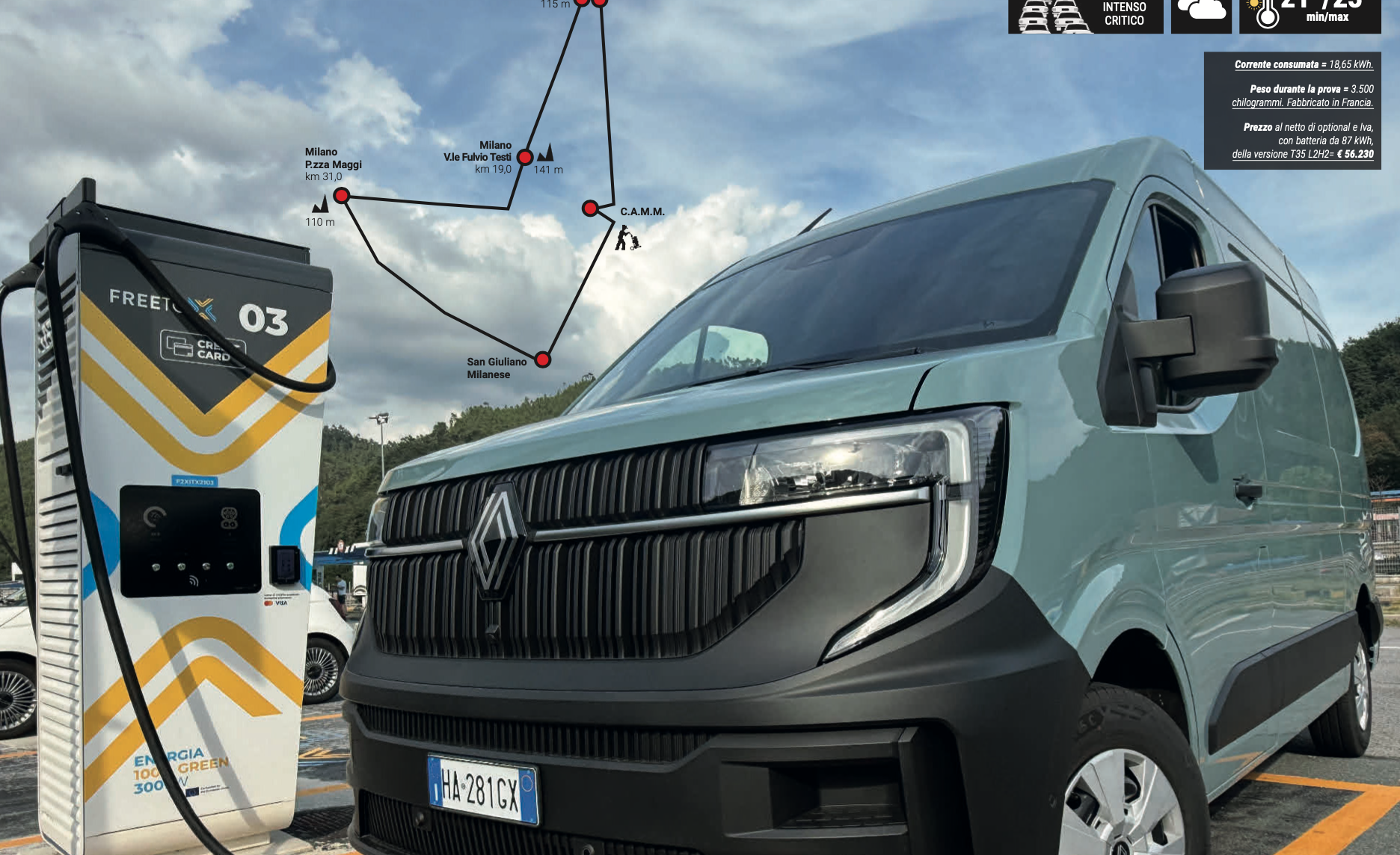 Mentre agendo sulla levetta del cambio e portandola su ‘B’ si attiva il massimo recupero in fase di rilascio, consentendo la guida ‘one pedal’. Attenzione a fidarsi troppo del navigatore di bordo, presente nel sistema d’infotainment con schermo tattile da 10 pollici, parecchi i bachi informatici. Così come da sempre succede con le Tesla, quando imposti il percorso il navigatore t’informerà sulle soste per ricarica ne- cessarie a raggiungere la meta. Ebbene, valutate sempre con la vostra testa, perché si tratta talvolta di soste inutili, in stazioni di ricarica fuori dalle autostrade che magari state percorrendo e che portano ad allungare notevolmente il viaggio, sia in termini chilometrici sia di tempo. Il consiglio? Per togliervi ogni stress di ricarica, attivate - a pagamento - ‘Mobilize charge pass’, un’App e una carta fisica per usufruire di tariffe vantaggiose sulla più grande rete di ricarica d’Europa: oltre un milione di colonnine in venticinque nazioni, incluse le Ionity ad altissima potenza. Noi l’abbiamo provato su un’infinità di caricatori di altrettanti operatori e non ci ha mai tradito. Infine, un’occhiata ai consumi. Con 3,32 chilometri/chilowattora, Master si piazza poco dietro al leader della nostra hit, che a oggi resta il cinese Maxus eDeliver 9 della Saic Motor.